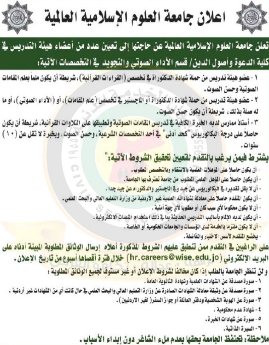 اعلان وظائف شاغرة صادر عن جامعة العلوم الاسلامية العالمية