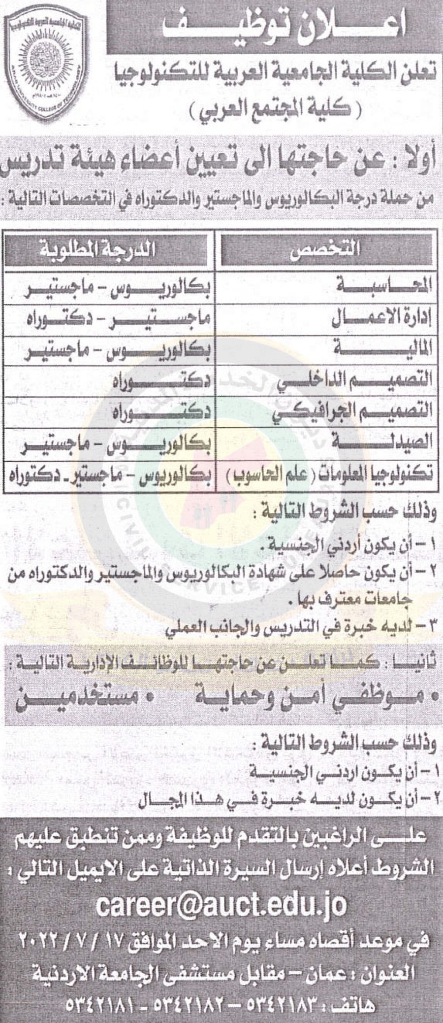 اعلان عن الحاجة لتعيين أعضاء هيئة تدريس صادر عن الكلية الجامعية العربية للتكنولوجيا