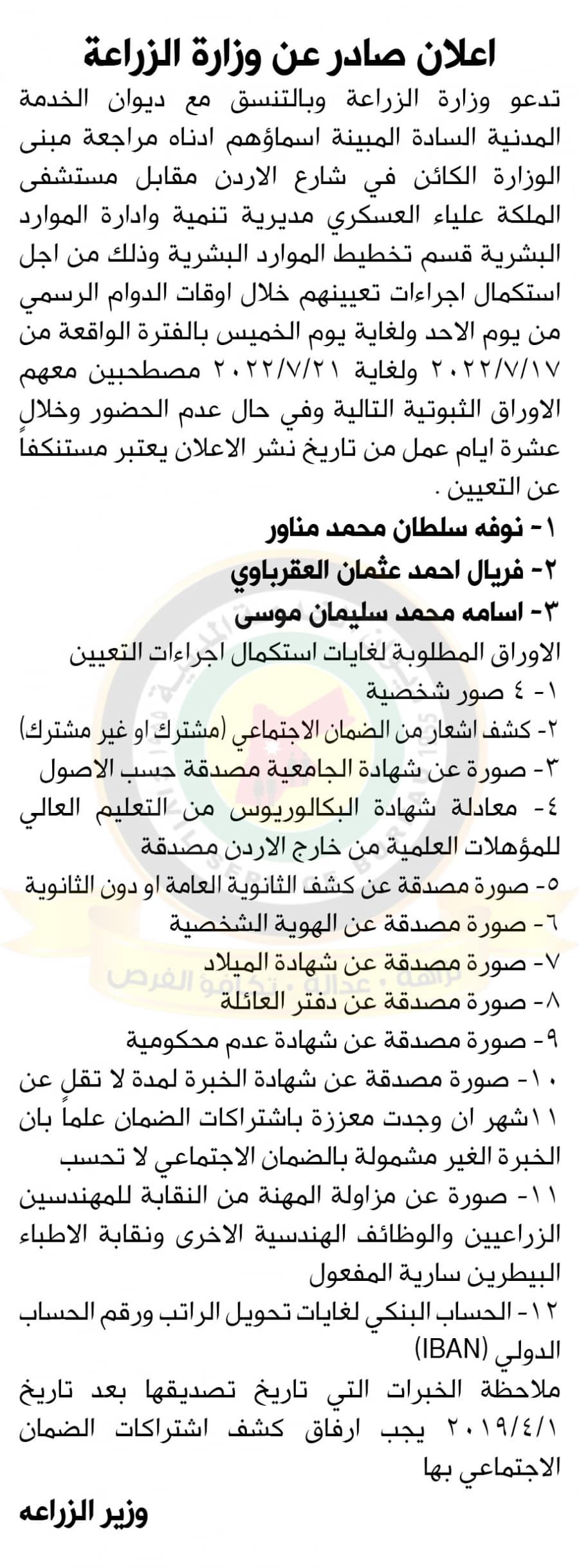 اعلان صادر عن وزارة الزراعة بخصوص استكمال اجراءات التعيين
