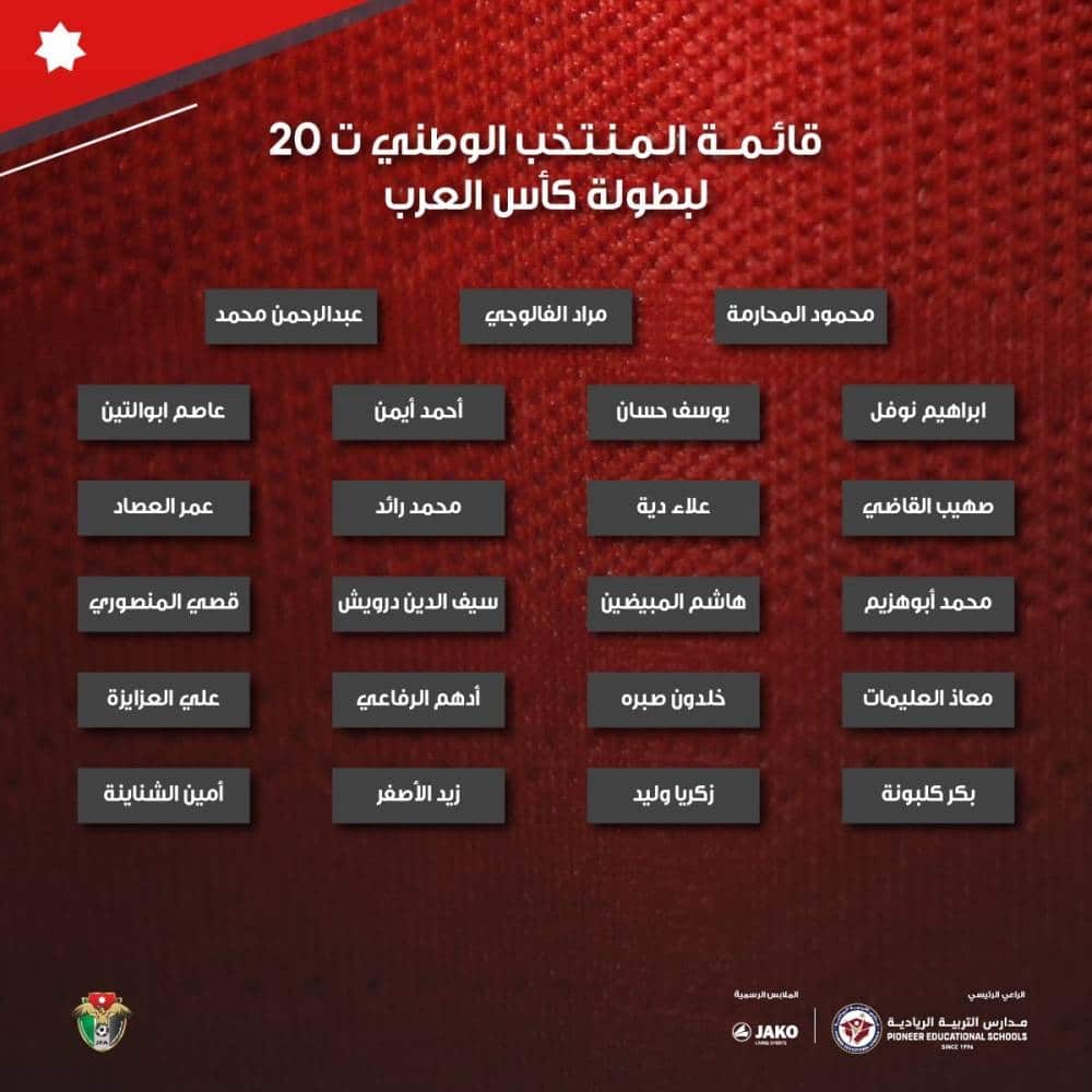 وضمت القائمة 23 لاعبا، هم محمود المحارمة، مراد الفالوجي، عبد الرحمن محمد، إبراهيم نوفل، يوسف حسان، أحمد أيمن، عاصم أبو التين، صهيب القاضي، علاء دية، محمد رائد، عمر العصاد، محمد أبو هزيم، هاشم المبيضين، سيف الدين درويش، قصي المنصوري، معاذ العليمات، خلدون صبرة، أدهم الرفاعي، علي العزايزة، بكر كلبونة، زكريا وليد، زيد الأصفر، أمين الشناينة.