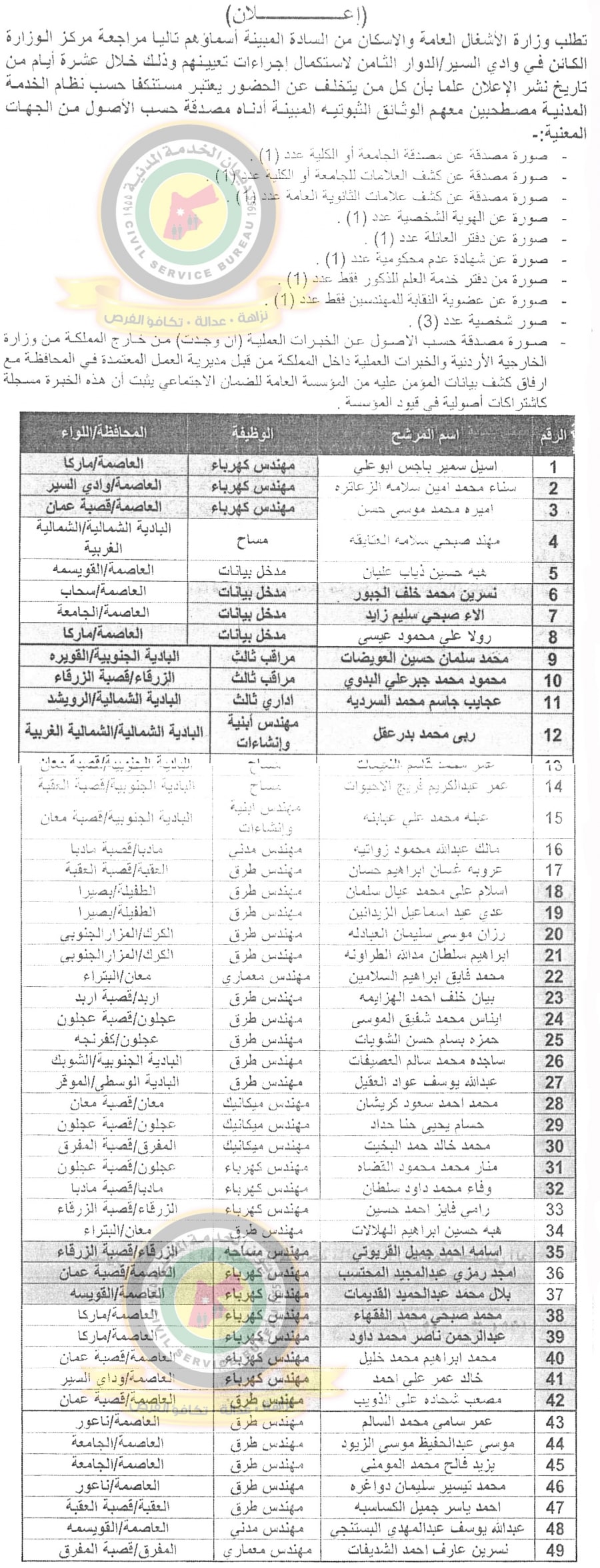 اعلان لاستكمال اجراءات التعيين صادر عن وزارة الاشغال العامة والاسكان