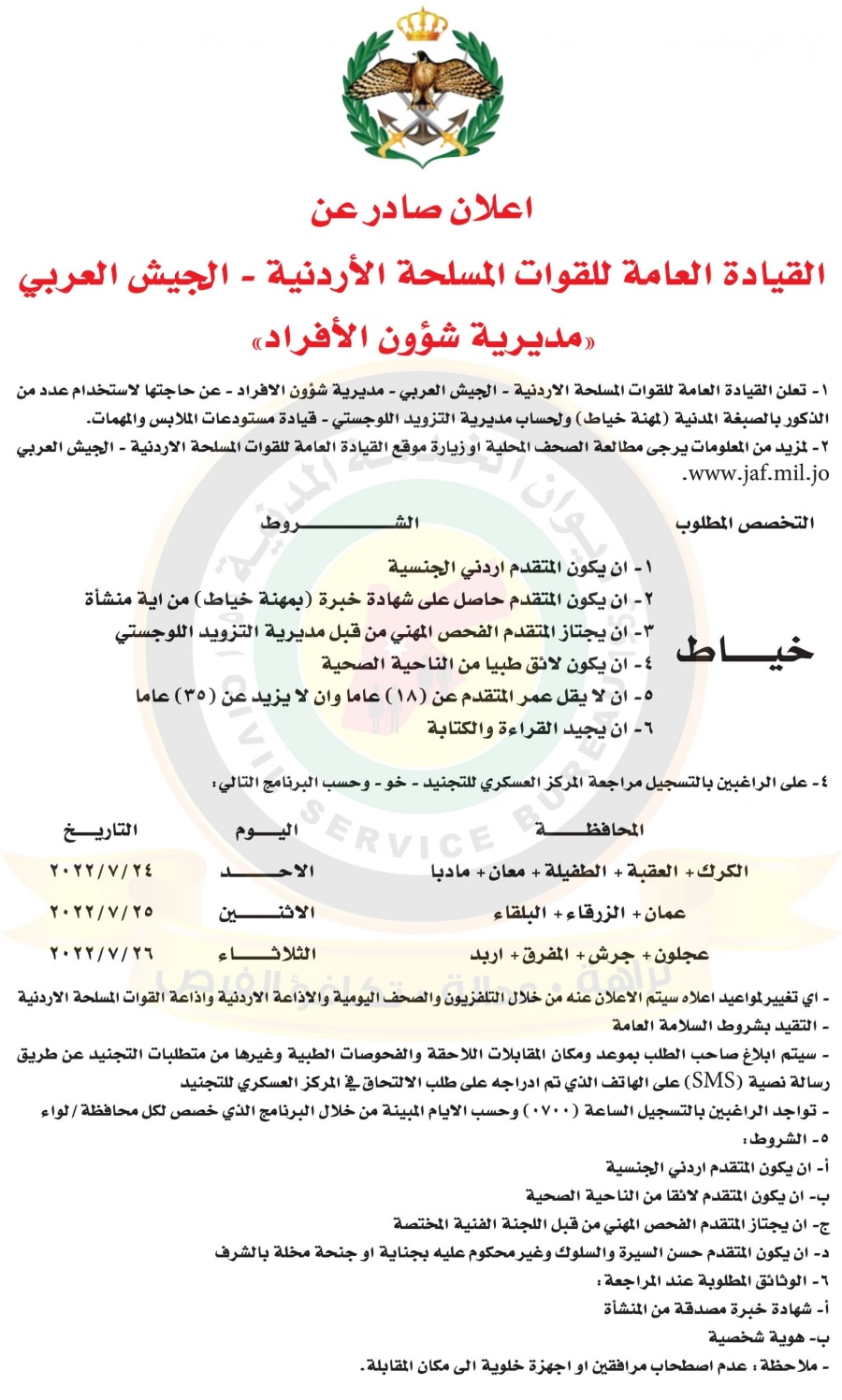 اعلان عن حاجة مديرية شؤون الافراد في القيادة العامة للقوات المسلحة -الجيش العربي لوظيفة خياط