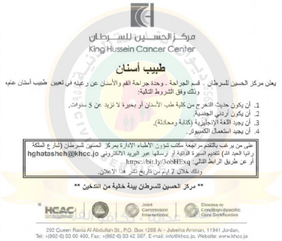 22 الاعلامي- اعلن ديوان الخدمة المدنية على موقعه الاللكتروني عن حاجة مركز الحسين للسرطان لوظيفة طبيب اسنان عام حسب الشروط التالية: