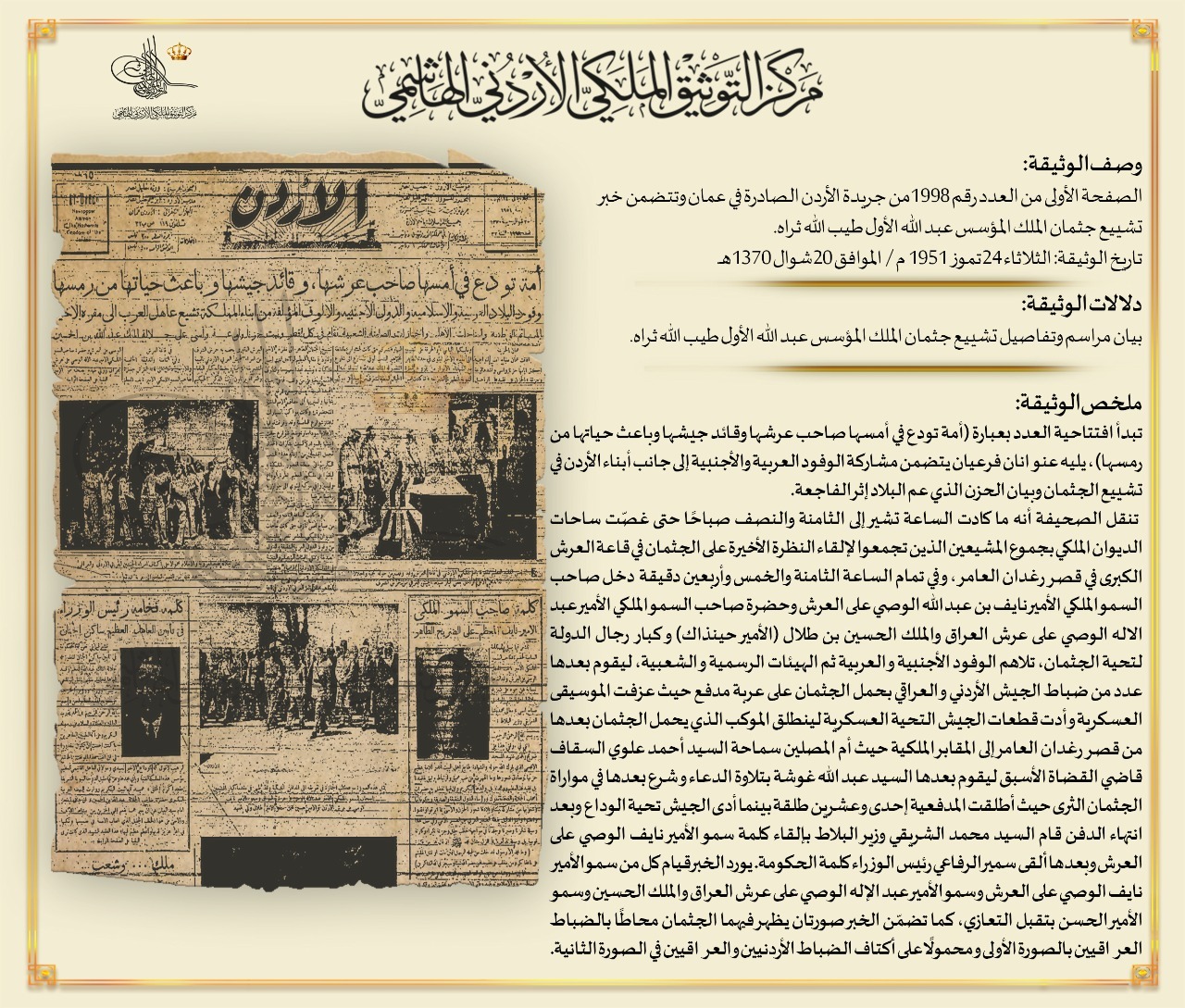 نشر مركز التوثيق الملكي الأردني الهاشمي، اليوم الأربعاء، وثيقة بمناسبة مرور 71 عامًا على استشهاد جلالة المغفور له الملك المؤسس عبد الله الأول بن الحسين، تبيّن مراسم وتفاصيل تشييع جثمانه كما وردت في افتتاحية صحيفة الأردن، الصادرة في 24 تموز سنة 1951 م الموافق 20 شوال سنة 1370هــ .