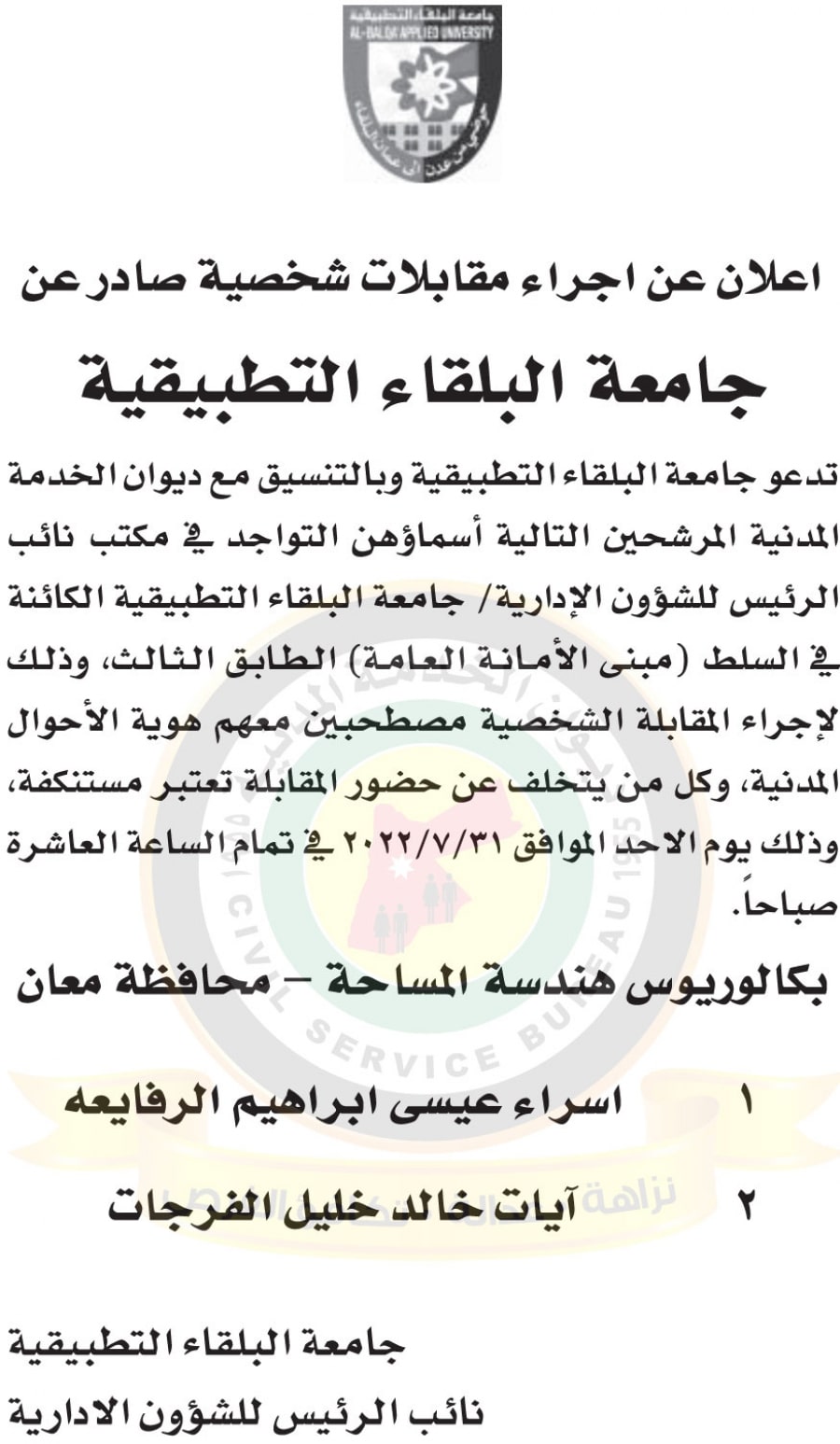 ديوان الخدمة المدنية: اعلان مقابلات شخصية صادر عن عدة مؤسسات