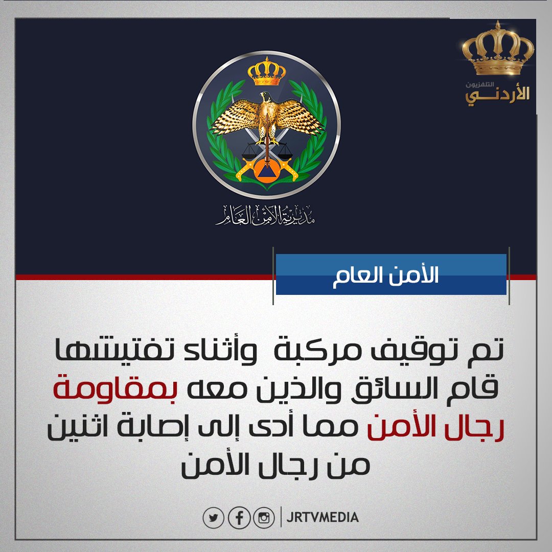 قال الناطق الإعلامي لمديرية الأمن العام أنه تم توقيف مركبة مساء امس الاثنين ، في إحدى مناطق العاصمة عمان، وأثناء تفتيشها قام السائق والذين معه بمقاومة رجال الأمن مما أدى إلى إصابة اثنين من رجال الأمن، وإصابة احد الأشخاص ممن كانوا في المركبة.