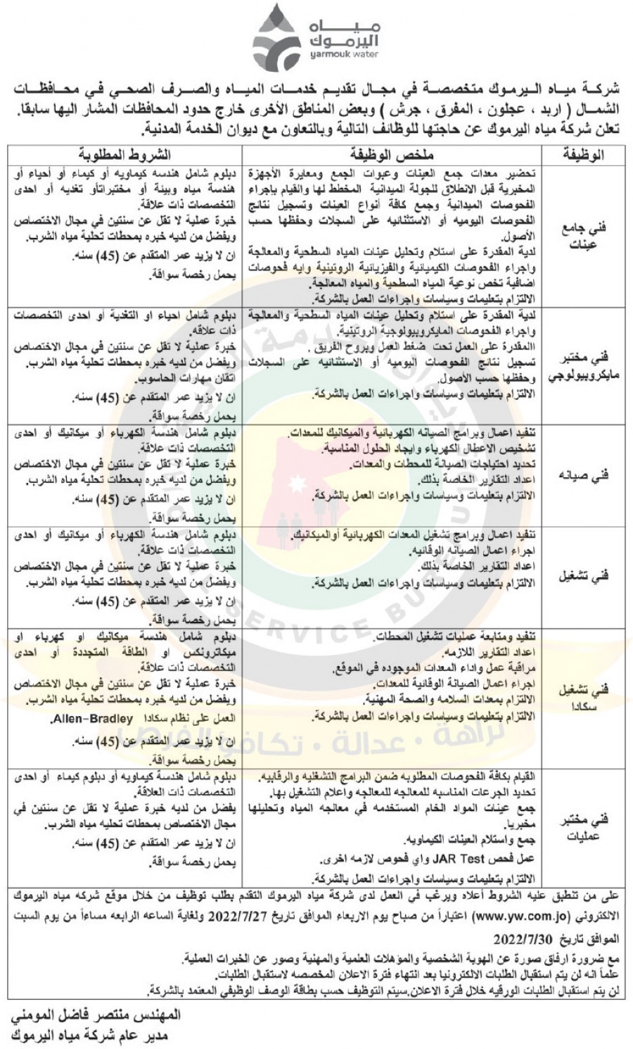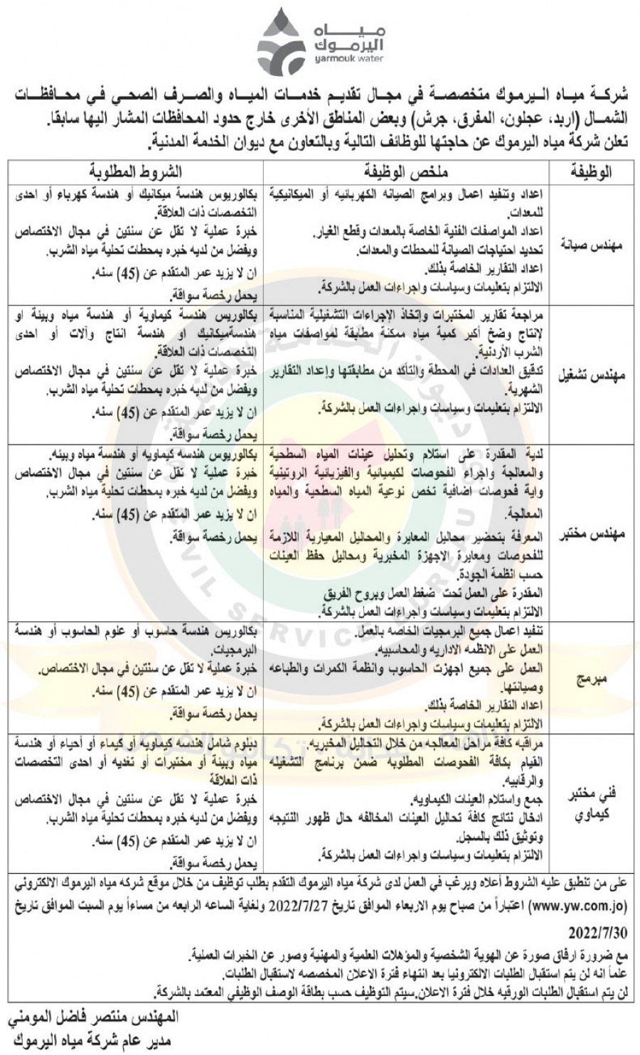 اعلان وظائف شاغرة صادر عن شركة مياه اليرموك