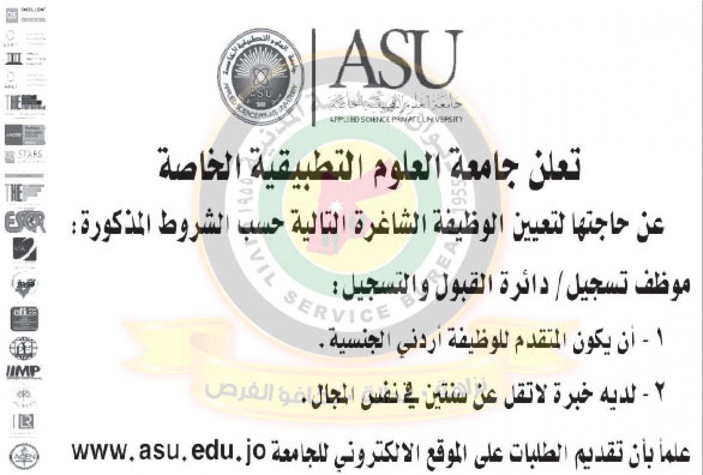 22 الاعلامي- تعلن جامعة العلوم التطبيقية الخاصة عن حاجتها لتعيين موظف تسجيل/دائرة القبول والتسجيل