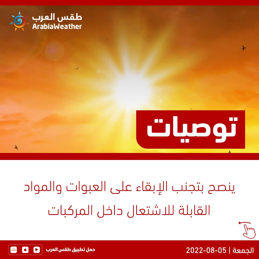 22 الاعلامي - نشر موقع طقس العرب توصيات هامة ننصح بإتباعها خلال نهار يوم #الجمعة مع استمرار الكتلة الهوائية الحارة