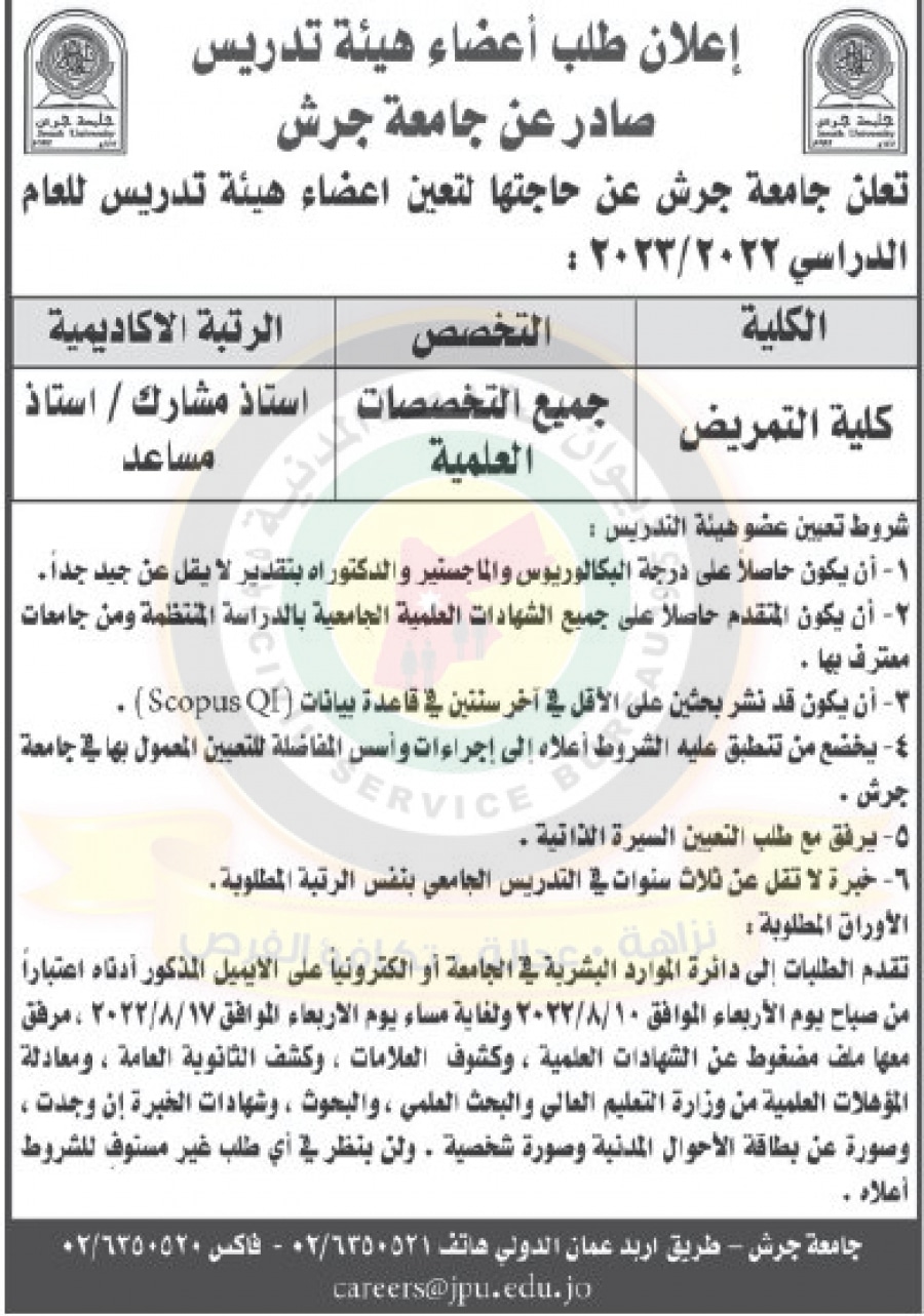 اعلان طلب أعضاء هيئة تدريس صادر عن جامعة جرش
