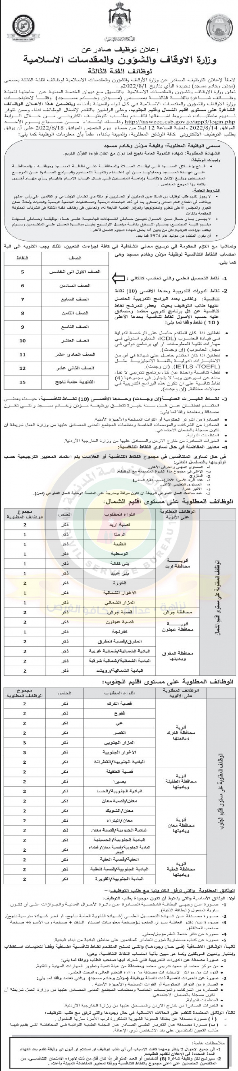 22 الاعلامي- نشر ديوان الخدمة المدنية اعلان توظيف صادر عن وزارة الاوقاف والشؤون والمقدسات الاسلامية لوظائف الفئة الثالثة