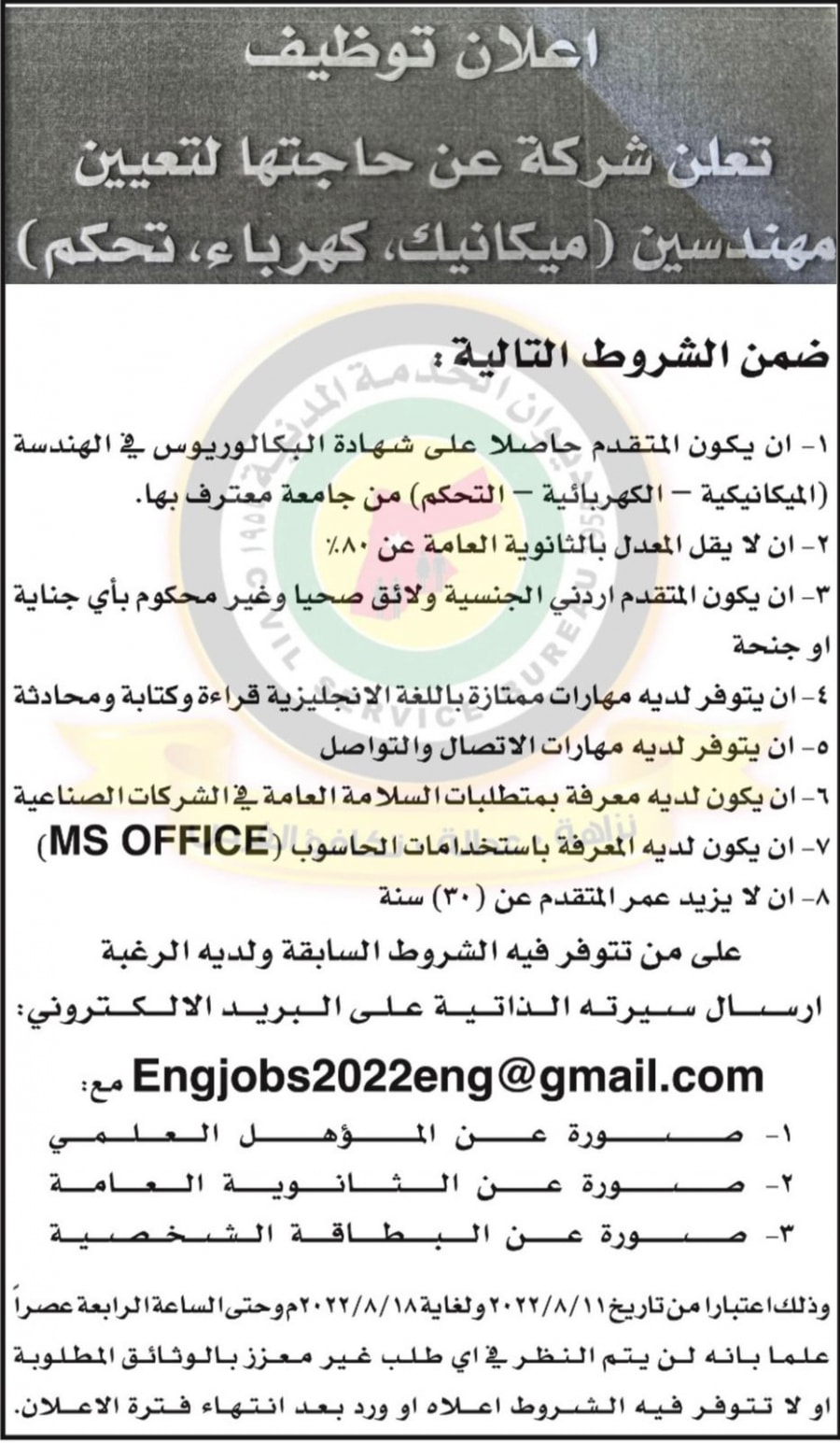 22 الاعلامي-اعلن ديوان الخدمة المدنبة عن حاجة شركة لتعيين مهندسين (ميكانيك، كهرباء، تحكم)