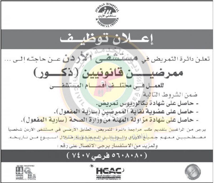 يعلن مستشفى الأردن عن حاجته إلى ممرضين قانونيين ذكور