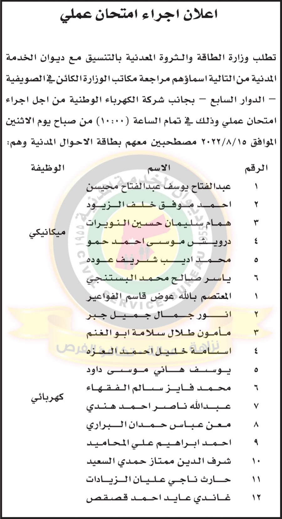 ديوان الخدمة المدنية: إعلان إجراء امتحان عملي صادر عن وزارة الطاقة والثروة المعدنية بتاريخ 15/8/2022