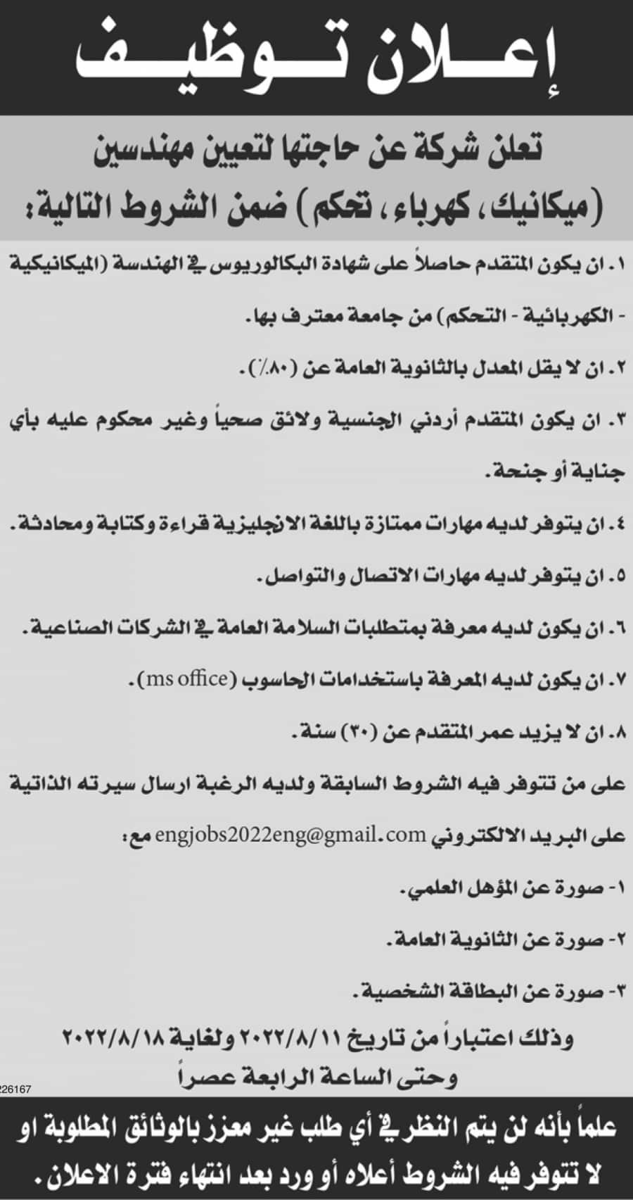 اعلان توفر شواغر مهندسين صادر عن شركة