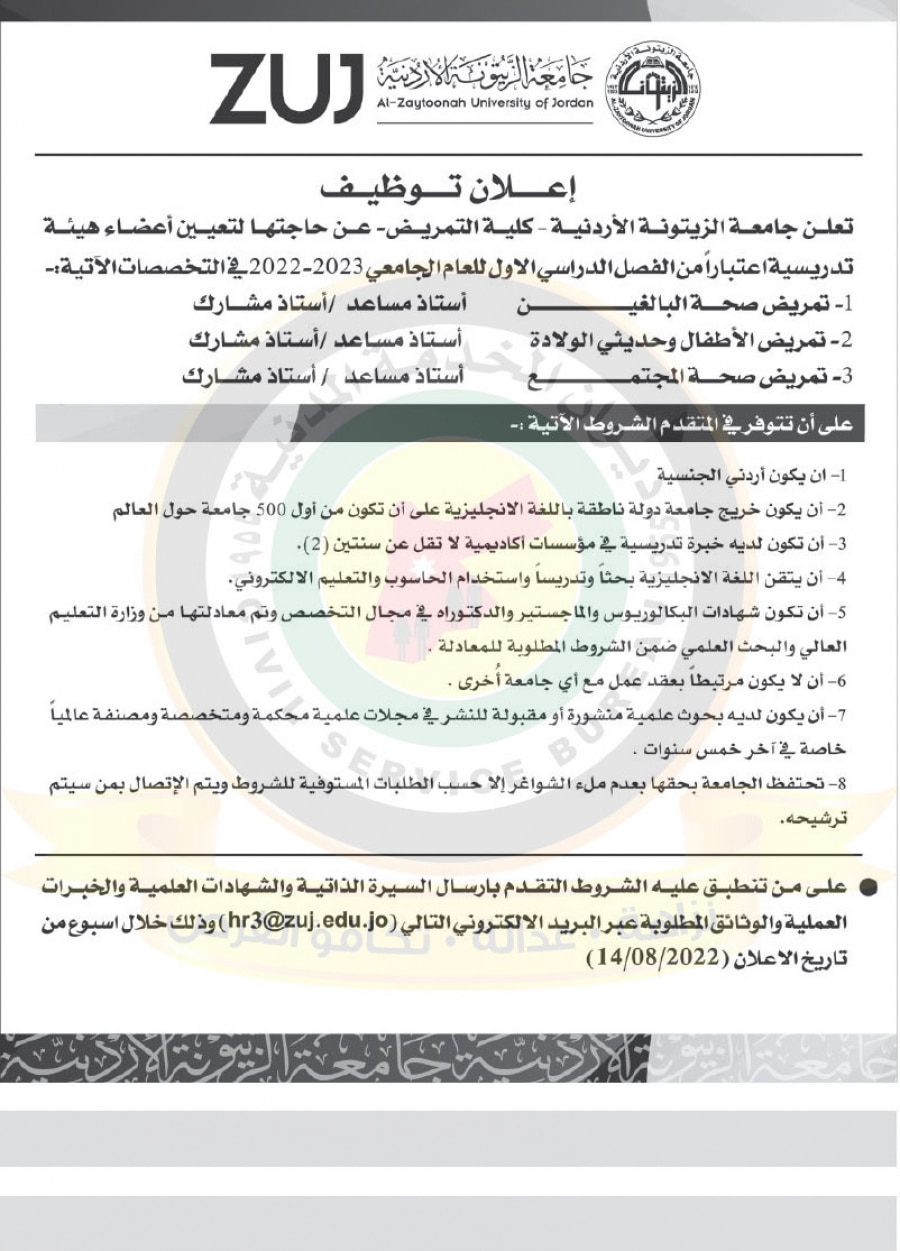 اعلان عن الحاجة لتعيين أعضاء هيئة تدريس صادر عن جامعة الزيتونة الاردنية