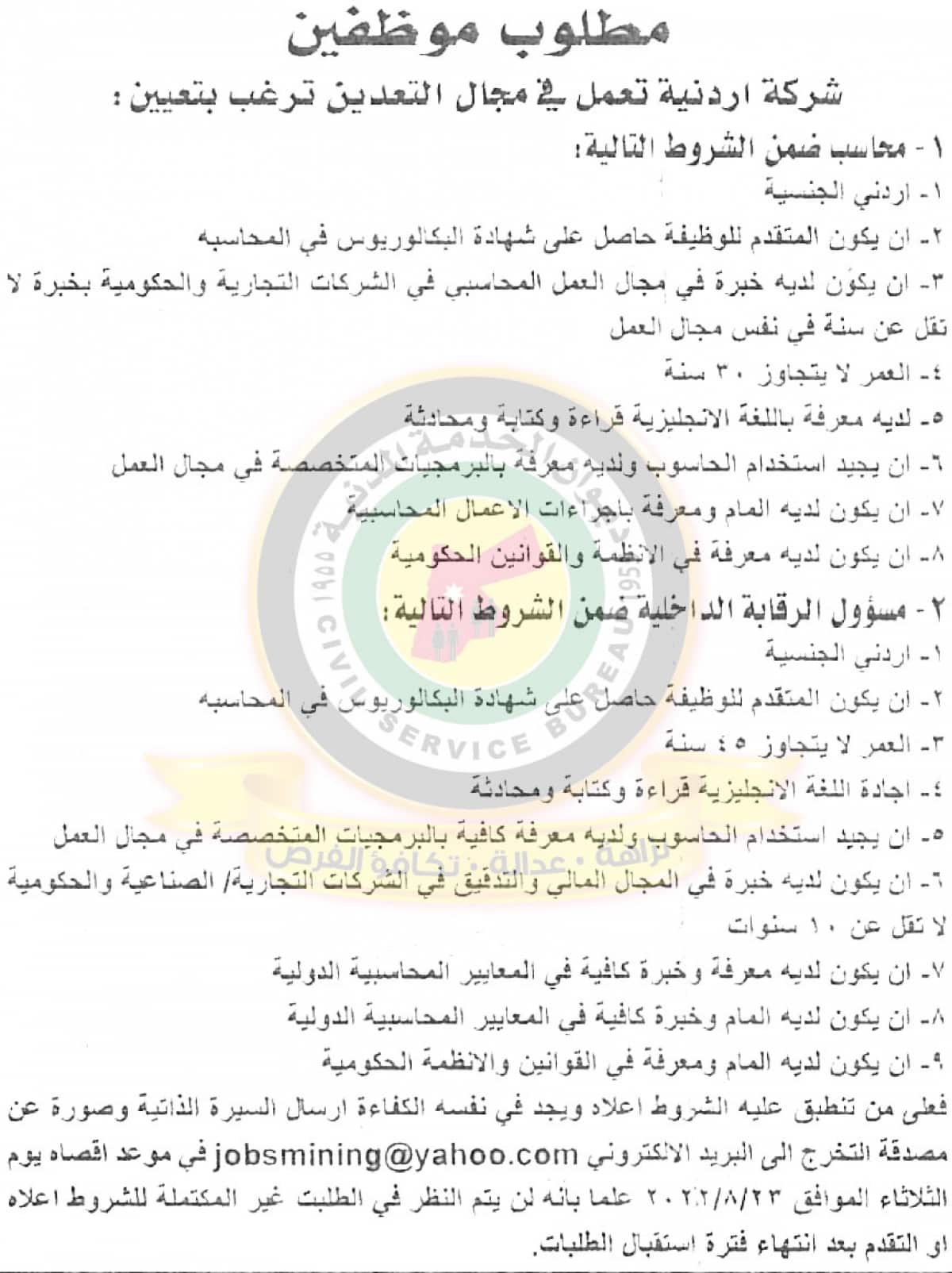 اعلان توفر شواغر صادر عن شركة اردنية تعمل في مجال التعدين