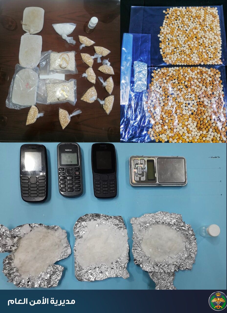كما وتم في محافظة اربد كذلك القاء القبض على احد مروجي المواد المخدرة وضبط بحوزته (5000) حبة من حبوب الكبتاجون المخدرة وثلاثة كفوف من مادة الحشيش المخدرة ونصف كيلو من مادة الكريستال المخدرة.
