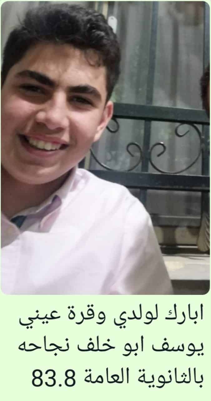22 الإعلامي- تهنئة وتبريك من الحاج كمال سلهب وعائلته المحترمين إلى الشاب الخلوق يوسف صالح أبو خلف ووالده ووالدته واخوته وآل أبو خلف وزلوم جميعاً بمناسبة نجاح يوسف بالثانوية العامة فرع العلمي بمعدل 83.8 الف الف مبارك، متمنين لك مزيدًا من التفوق والنجاح.
