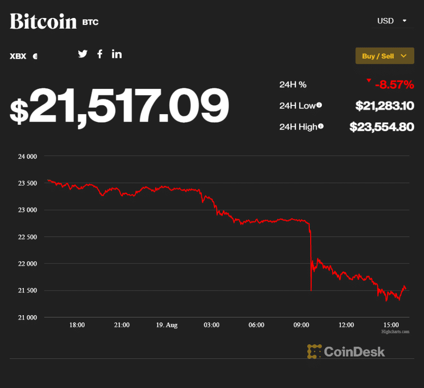 ووفقا لبيانات موقع "كوين ديسك"، تراجعت قيمة عملة "البيتكوين"، بحلول الساعة 16:08 بتوقيت موسكو، بنسبة 8.61% إلى 21521.8 دولار.