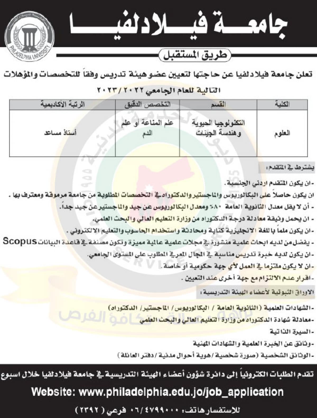 اعلان عن الحاجة لتعيين عضو هيئة تدريس صادر عن جامعة فيلادلفيا