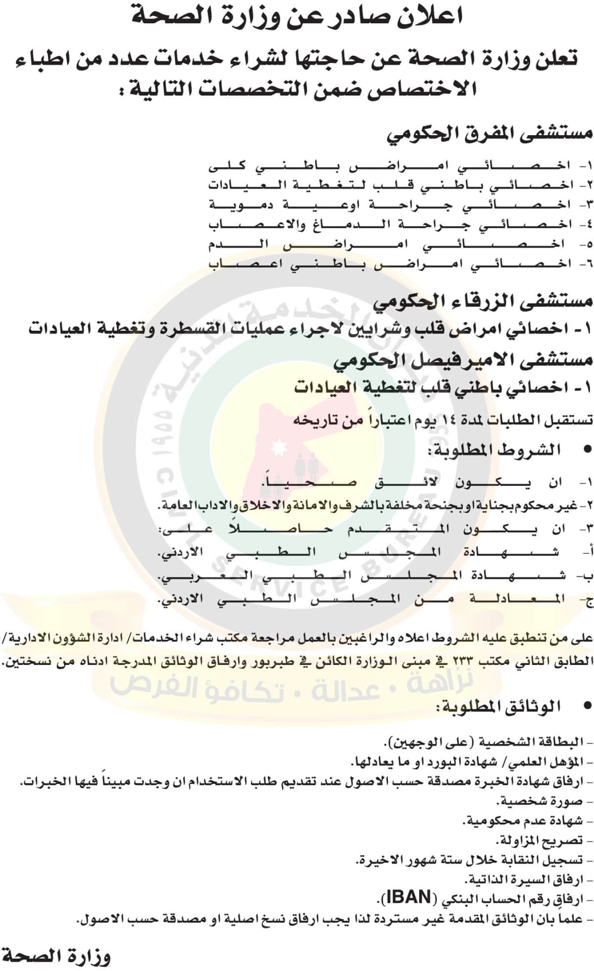 22 الاعلامي- اعلان صادر عن وزارة الصحة بخصوص حاجتها لشراء خدمات عدد من اطباء الاختصاص