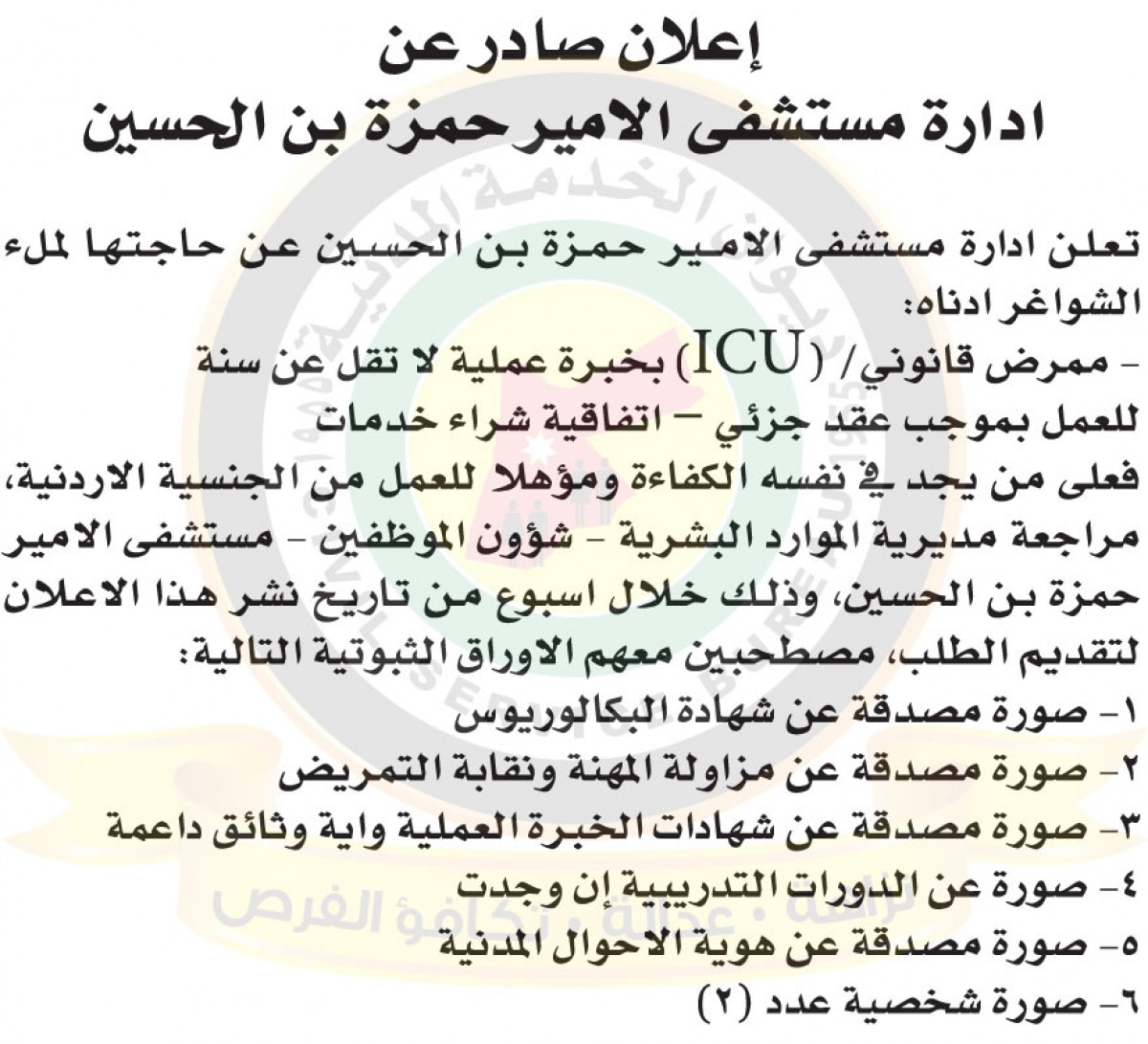 اعلان عن توفر وظيفة شاغرة للعمل بموجب عقد جزئي -اتفاقية شراء خدمات صادر عن مستشفى الامير حمزة بن الحسين