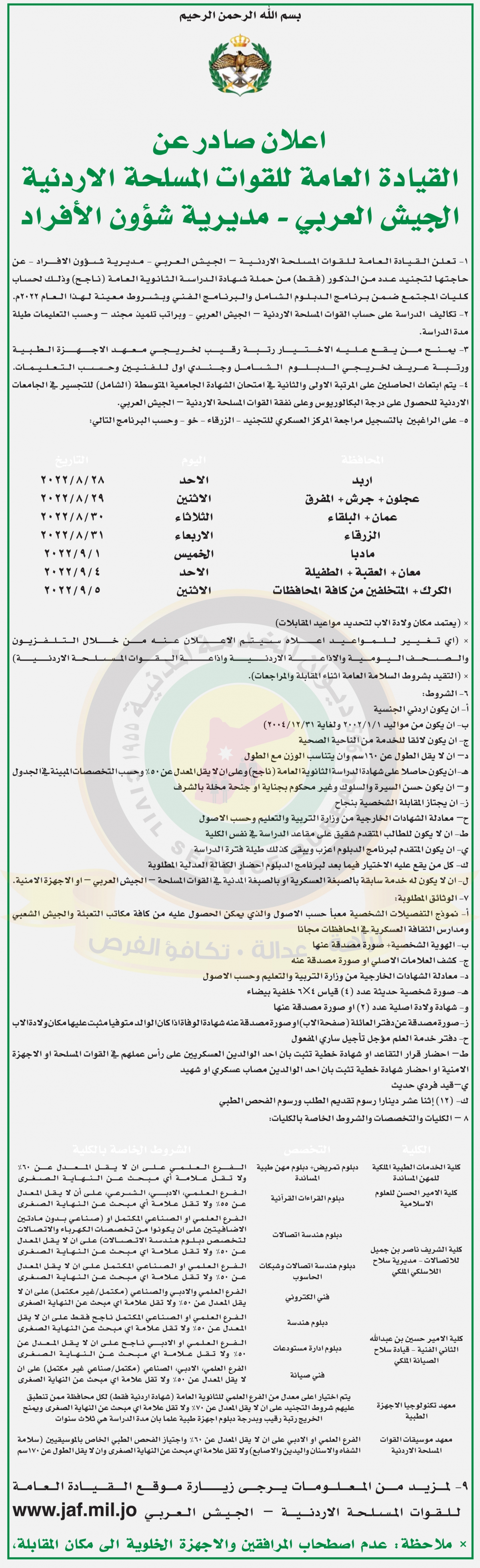 اعلان وظائف شاغرة صادرعن القيادة العامة للقوات المسلحة الاردنية