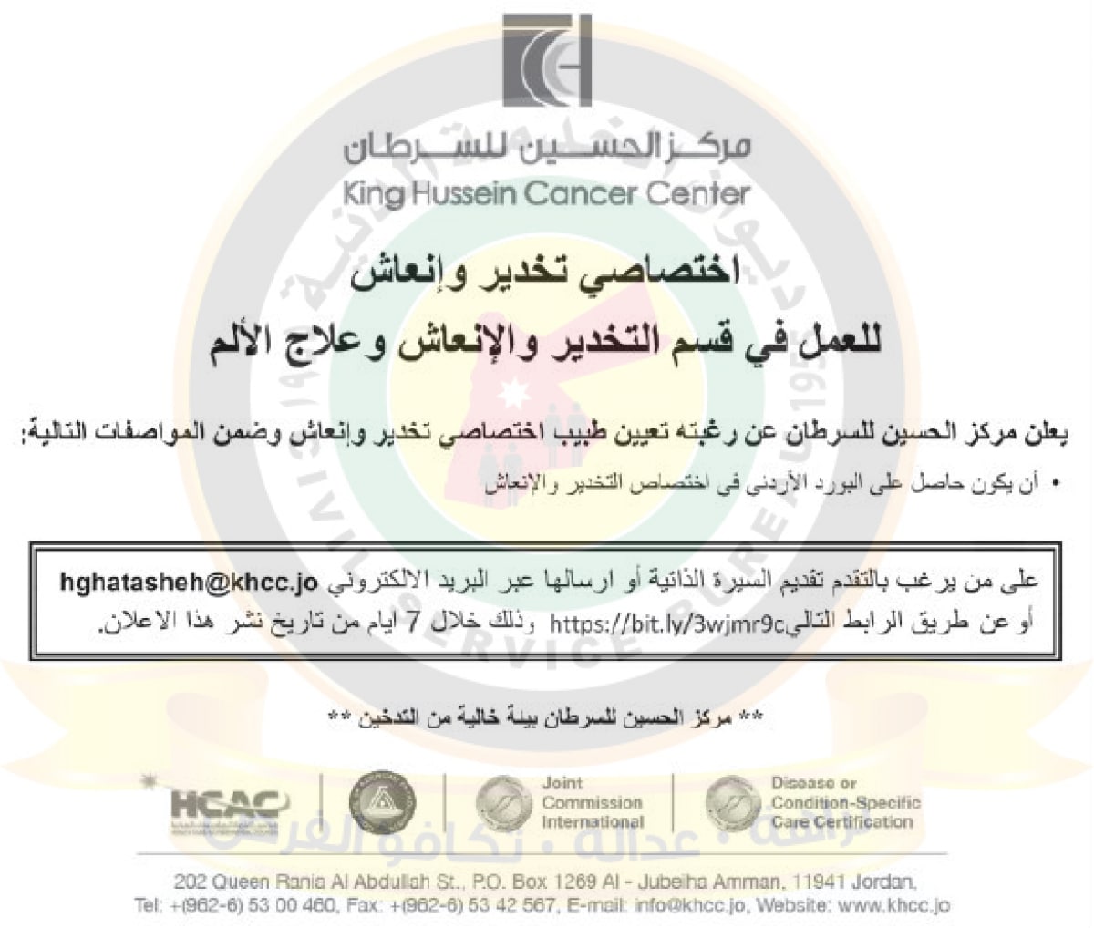 اعلان وظائف شاغرة صادر عن مركز الحسين للسرطان