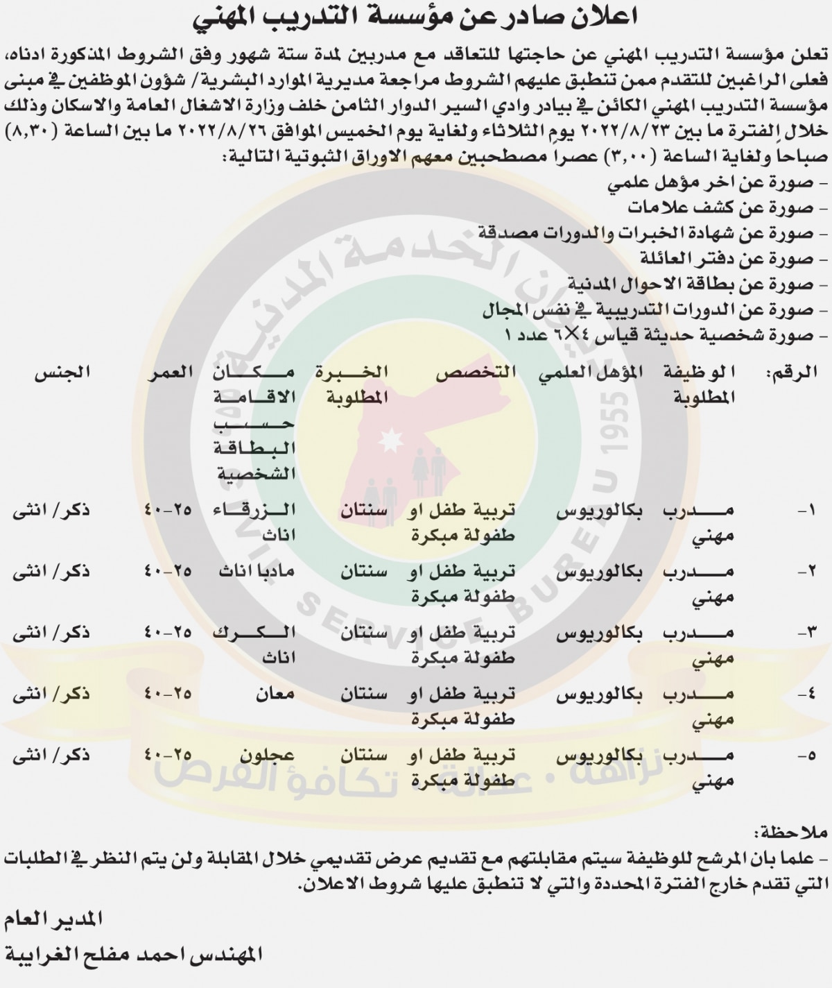 22 الاعلامي- اعلان وظائف شاغرة لمدربين صادر عن مؤسسة التدريب المهني -عقد لمدة ستة شهور