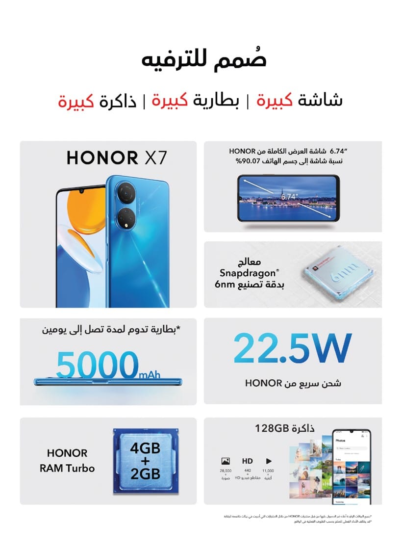 أطلقت HONOR مؤخراً هاتف HONOR X7 الجديد وهو هاتف مثالي للمستخدمين الذين يطالبون بمزيد من القوة للعمل والدراسة والترفيه ويستهدف المحترفين والطلاب الذين يستخدمون هواتفهم كأداة حيوية للترفيه والبقاء في نفس الوقت على اتصال بأصدقائهم وعائلاتهم. يتميز HONOR X7 الجديد ببطارية طويلة الأمد للإنتاجية طوال اليوم، مع تقديم تجربة ترفيهية غامرة وجودة فائقة بسعر مقبول.