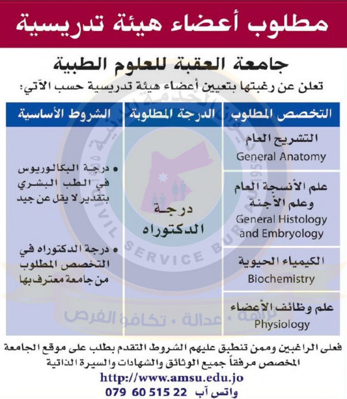 اعلان عن الحاجة لتعيين أعضاء هيئة تدريسية صادر عن جامعة العقبة للعلوم الطبية