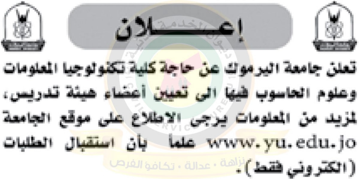 22 الاعلامي- اعلان عن الحاجة لتعيين أعضاء هيئة تدريسية صادر عن جامعة اليرموك