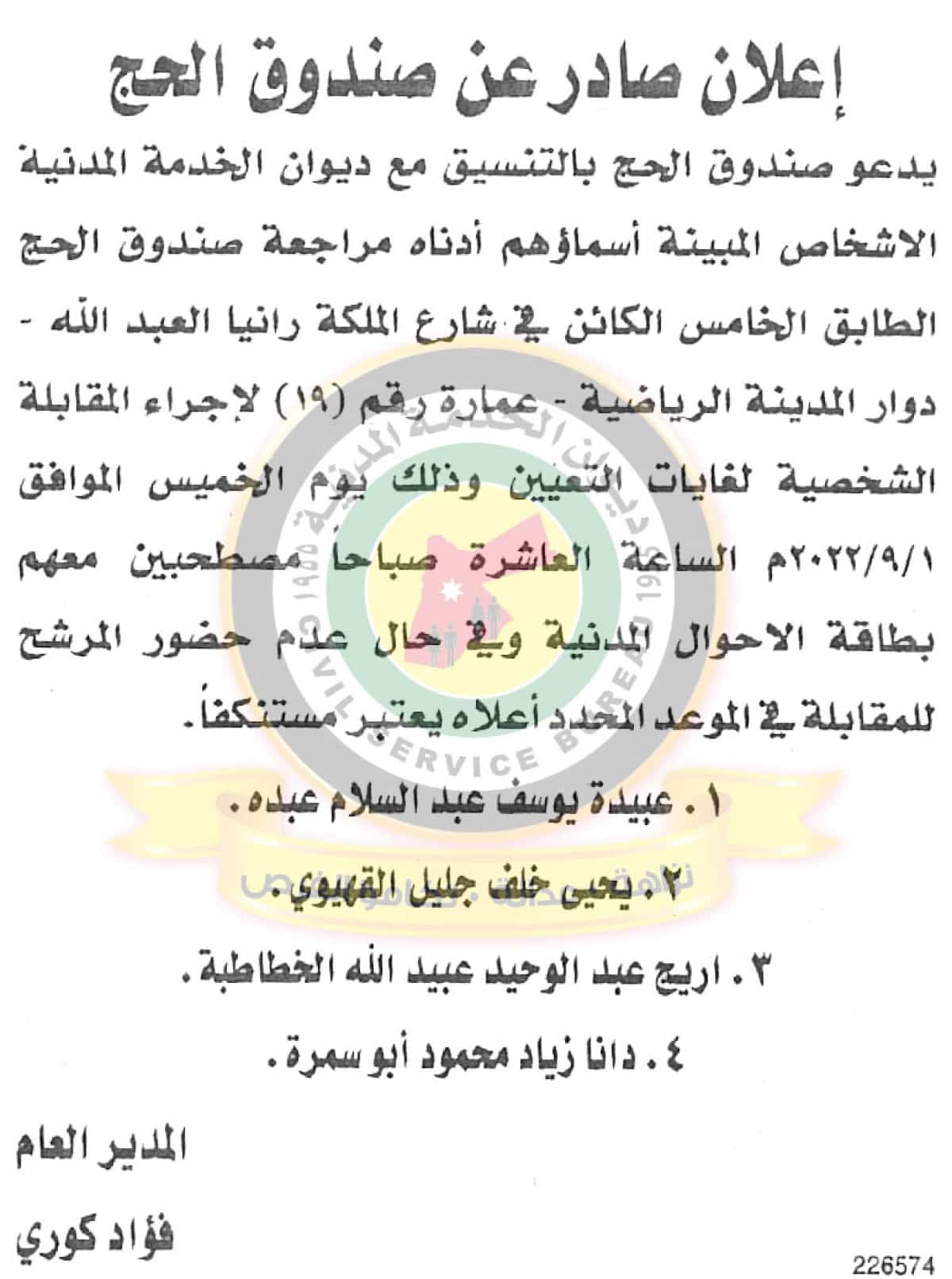 اعلان مقابلات شخصية صادر عن صندوق الحج بتاريخ 1/9/2022