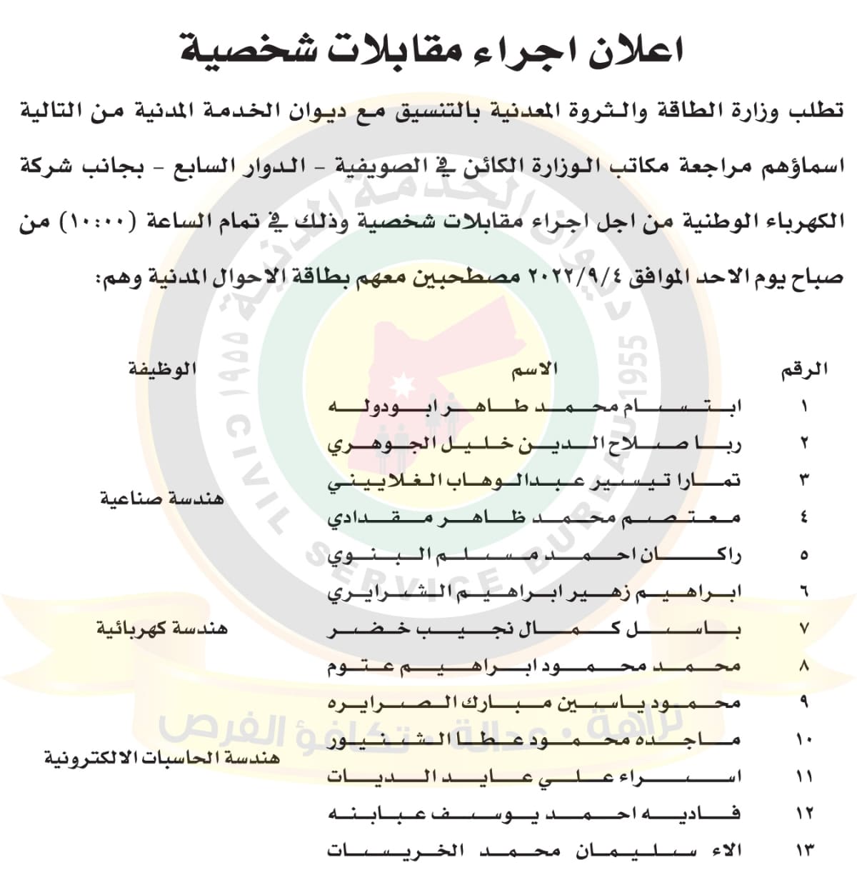 اعلان مقابلات شخصية صادر عن وزارة الطاقة والثروة المعدنية