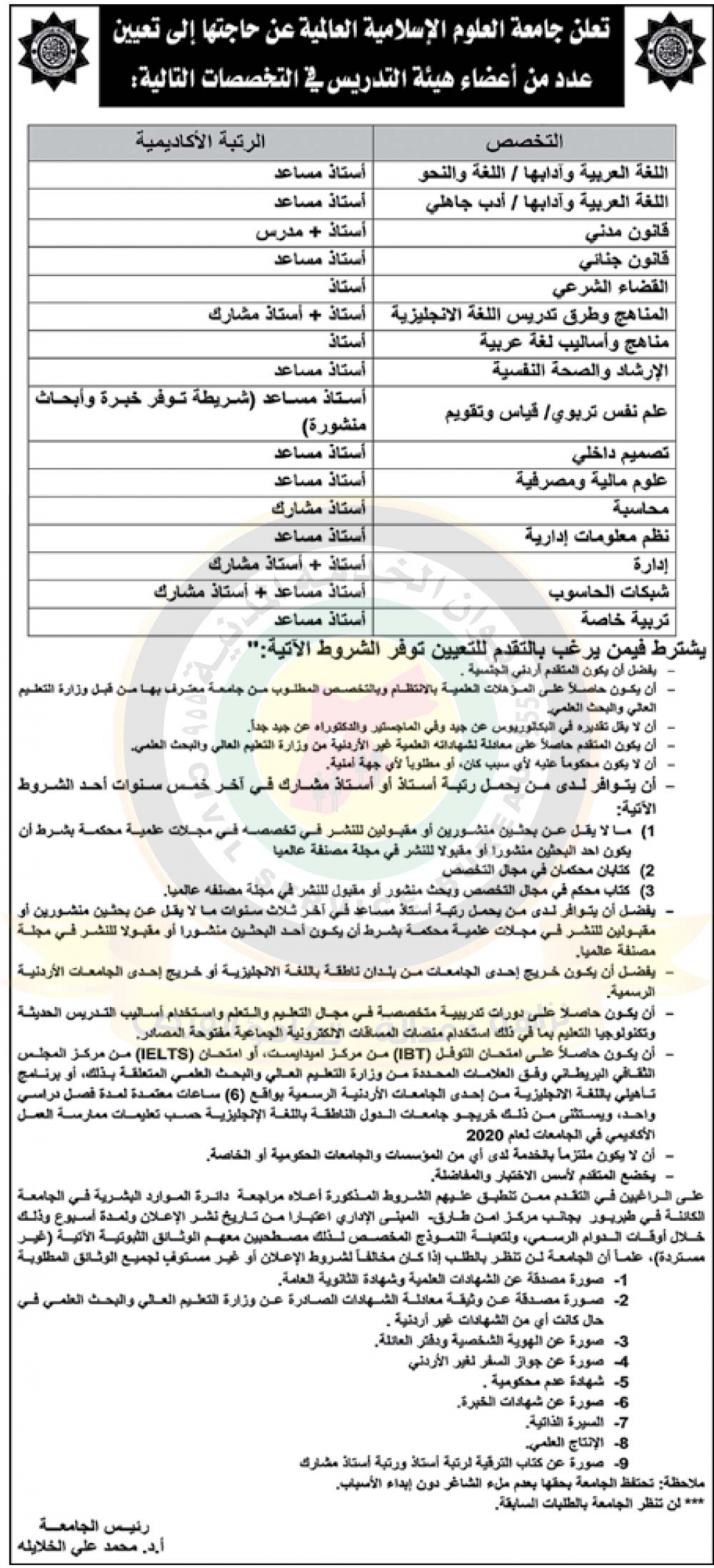 اعلان لتعيين عدد من اعضاء هيئة تدريس صادر عن جامعة العلوم الاسلامية العالمية