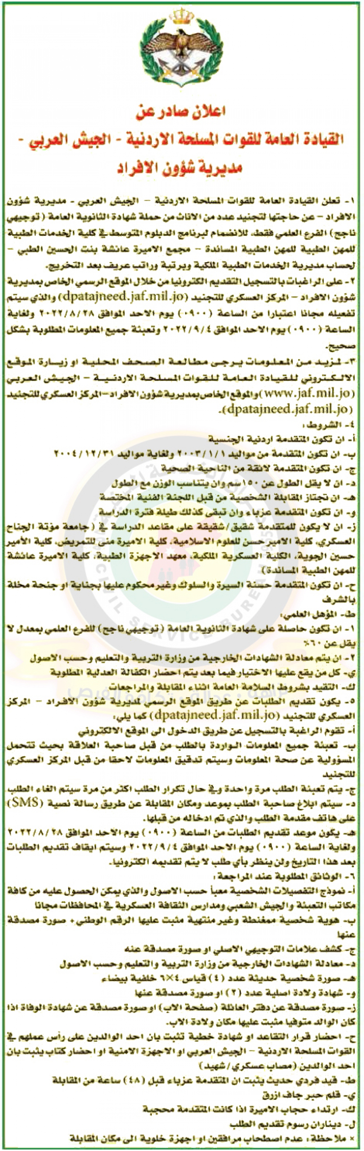اعلان لتجنيد عدد من الاناث من حملة شهادة الثانوية العامة (توجيهي ناجح) صادر عن القيادة العامة للقوات المسلحة الاردنية - الجيش العربي