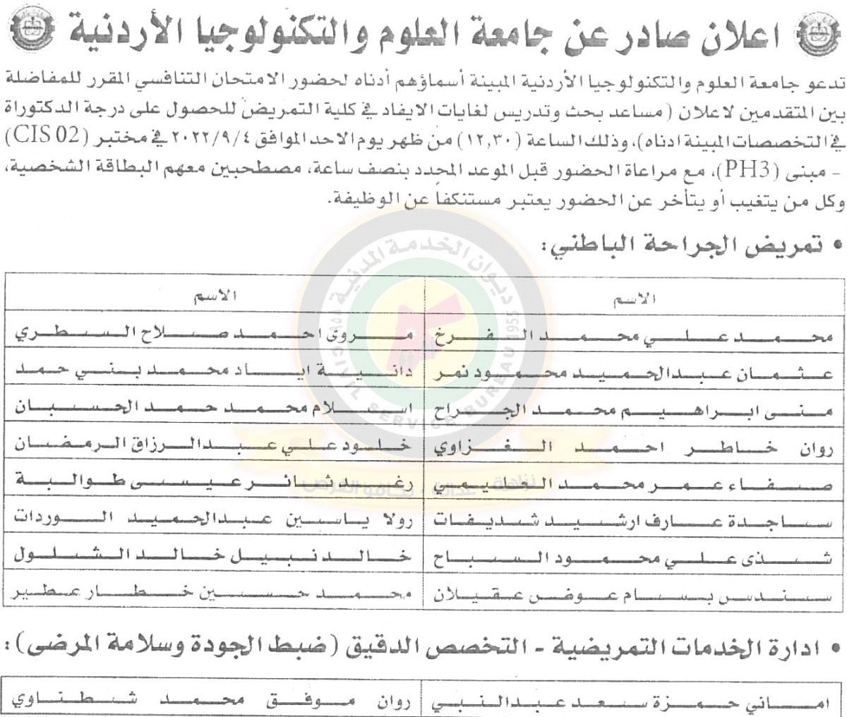 اعلان امتحان صادر عن جامعة العلوم والتكنولوجيا الاردنية بتاريخ 4/9/2022
