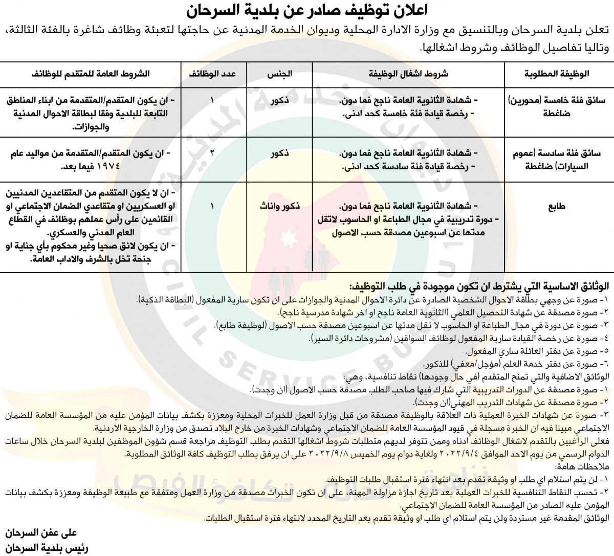 اعلان عن توفر وظائف شاغرة في الفئة الثالثة صادر عن بلدية السرحان