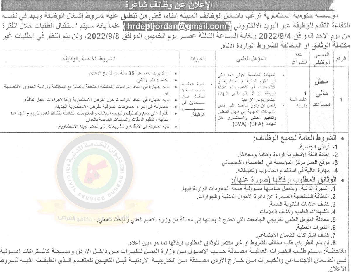 22 الاعلامي- اعلان وظائف شاغرة صادر عن شركة حكومية استثمارية