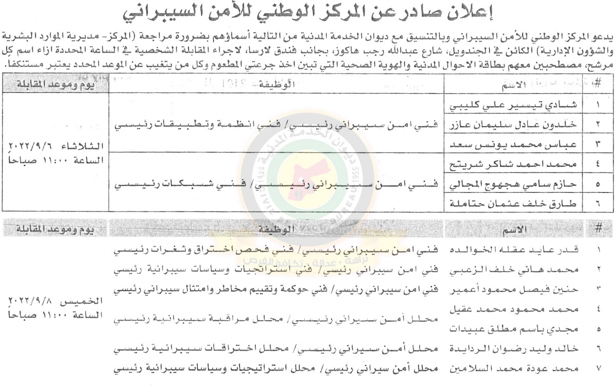 اعلان مقابلات شخصية صادر عن المركز الوطني للامن السيبراني