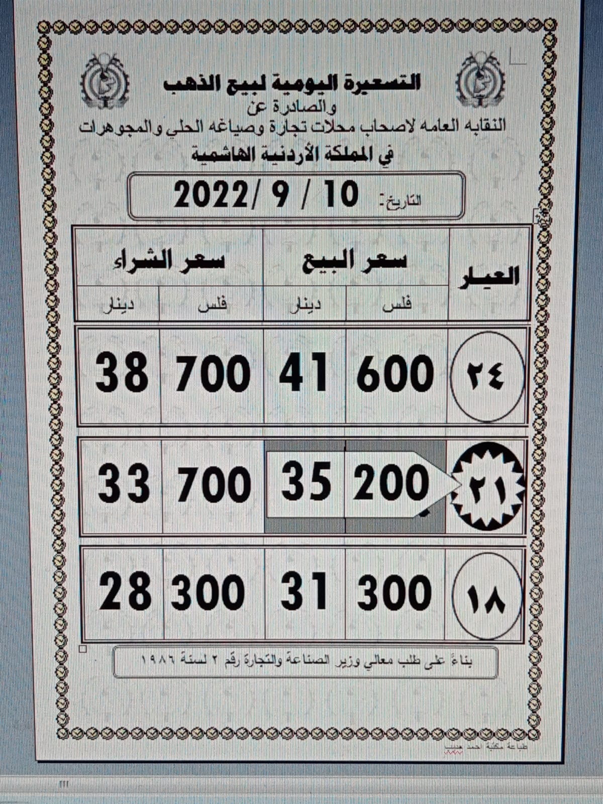 22 الإعلامي- أصدرت النقابة العامة لأصحاب محلات تجارة و صياغة الحُلي والمُجوهرات، نشرة تسعيرة الذهب المحلي وحسب رصد موقع 22 الإعلامي لنشرة الـيوم الموافق السبت 10/9/2022 في المملكة الأردنية الهاشمية .