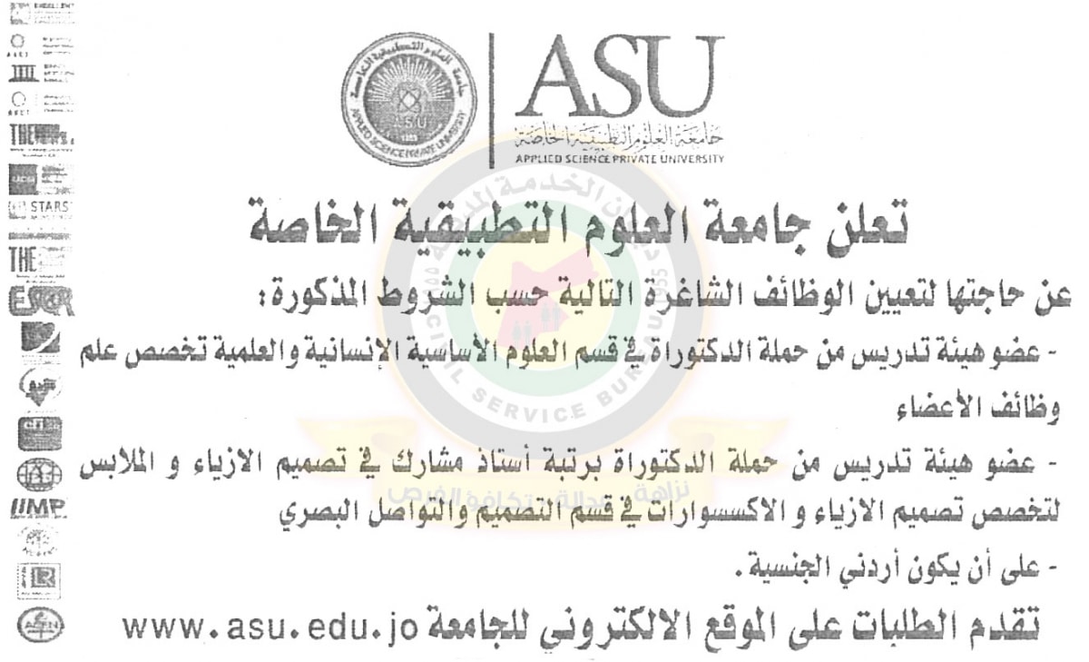 اعلان وظائف اعضاء تدريس صادر عن جامعة العلوم التطبيقية الخاصة