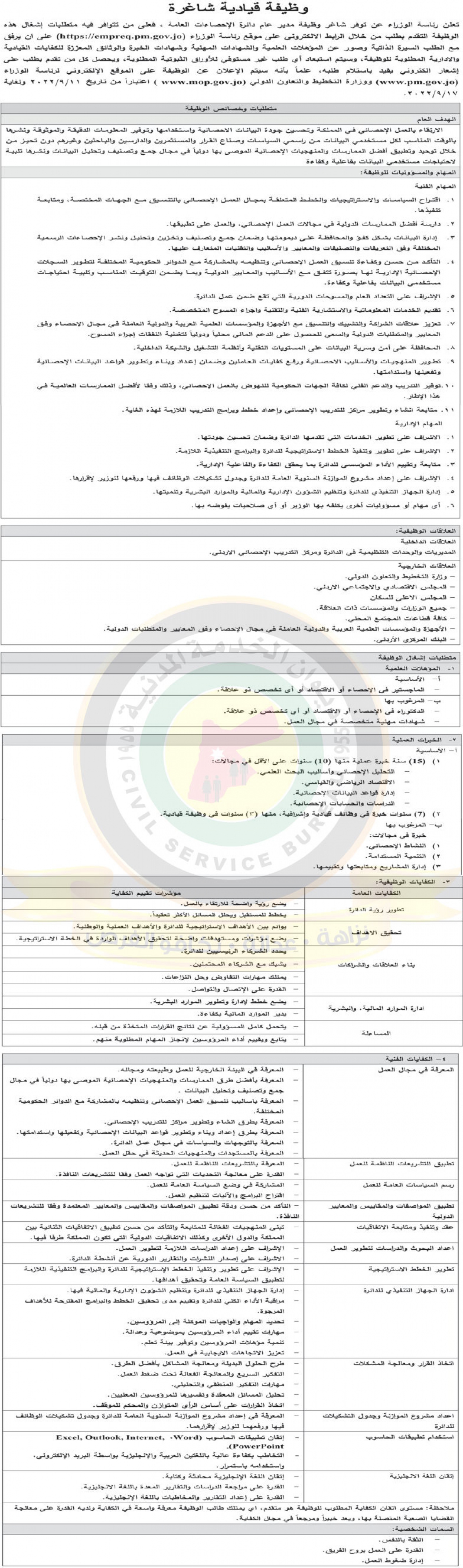 22 الاعلامي- اعلان عن توفر وظيفة قيادية شاغرة مدير عام دائرة الاحصاءات العامة صادر عن رئاسة الوزراء