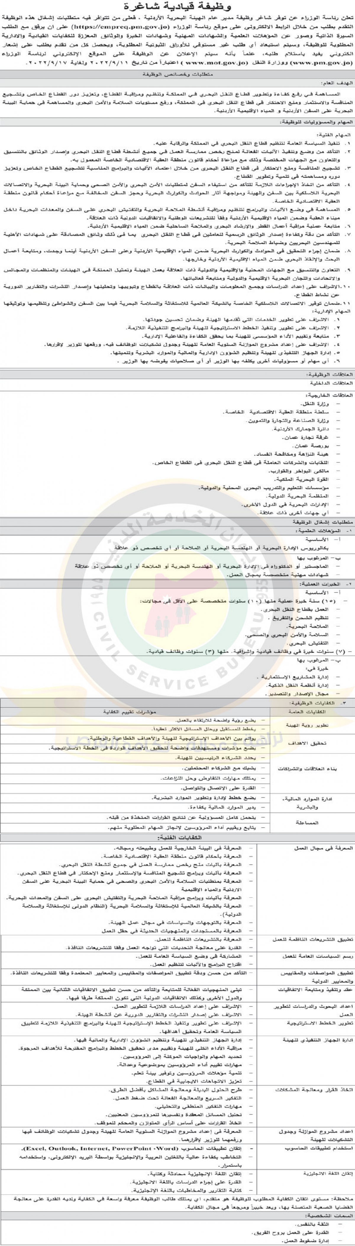 22 الاعلامي- اعلان عن توفر وظيفة قيادية شاغرة مدير عام الهيئة البحرية الاردنية صادر عن رئاسة الوزراء