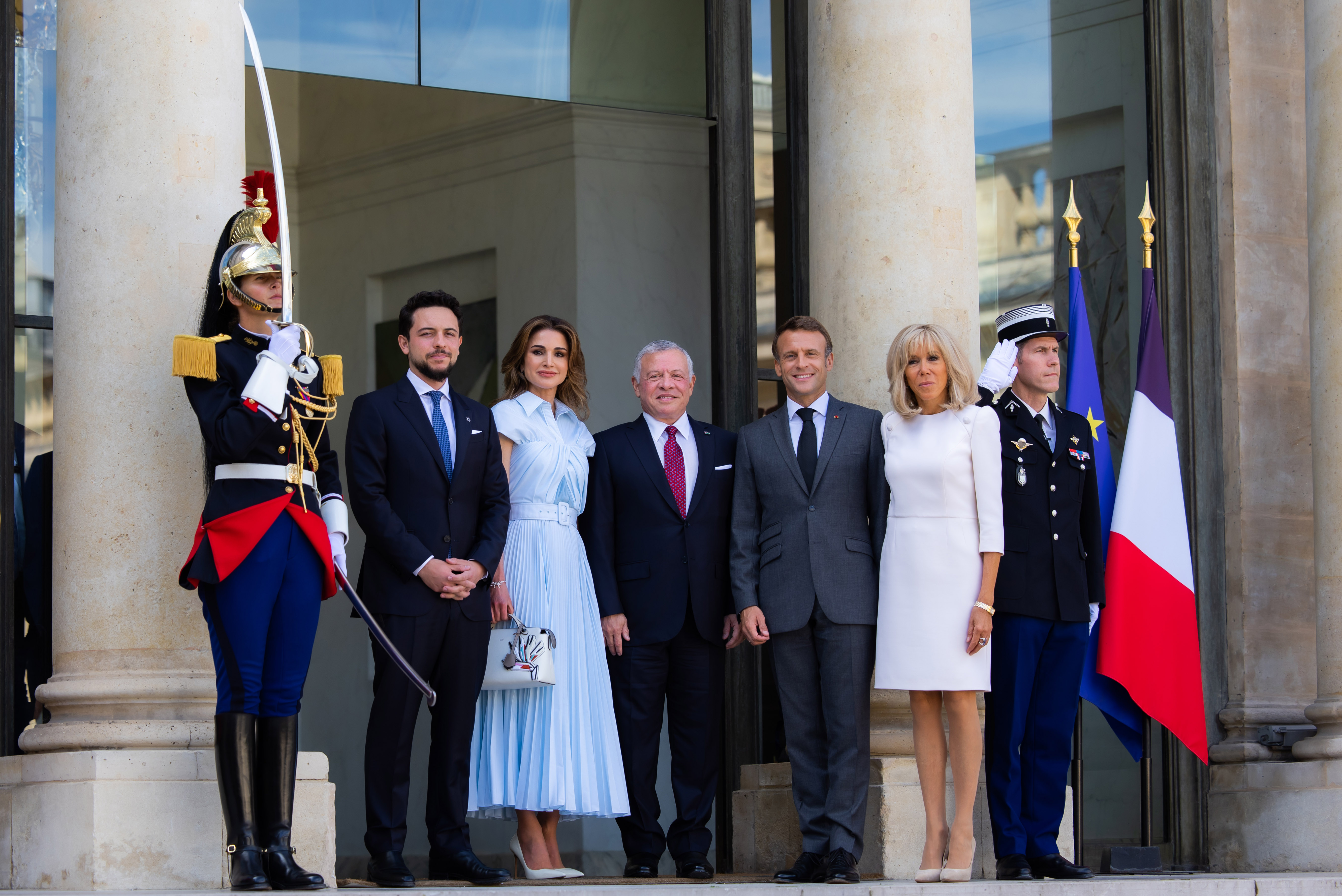 ولدى وصول جلالة الملك، ترافقه جلالة الملكة رانيا العبدالله وسمو الأمير الحسين بن عبدالله الثاني ولي العهد إلى قصر الإليزيه، كان الرئيس الفرنسي إيمانويل ماكرون والسيدة عقيلته بريجيت ماكرون في مقدمة المستقبلين.