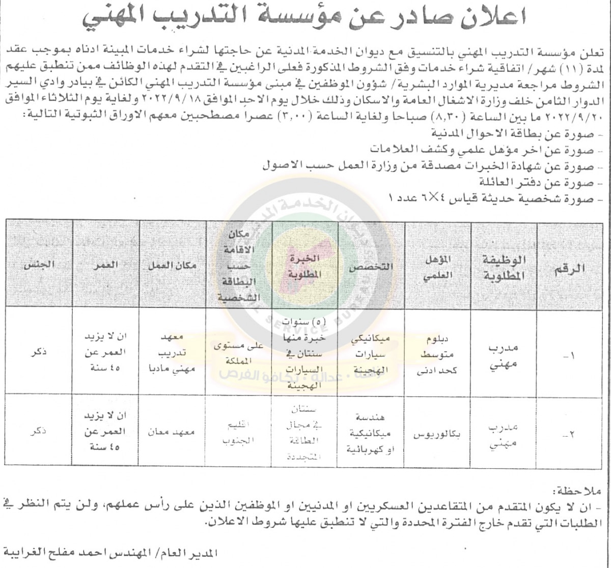 22 الاعلامي- اعلان عقد شراء خدمات لشاغرين لمدة 11 شهر صادر عن مؤسسة التدريب المهني