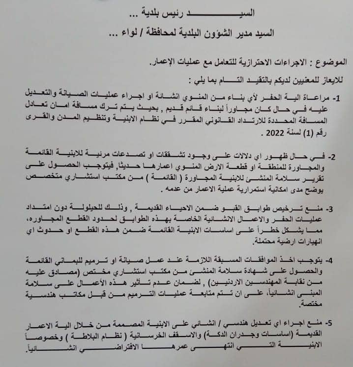 وكذلك تضمن التعميم تفعيل ما ورد في نص المادة 38 من قانون التنظيم رقم 79 لسنة 1966والخاصة بإجراء مراقبة الاعمار والابنية وإجراءات التنفيذ والتقيد بما ورد في نص المادة11من قانون البناء الوطني الأردني رقم 7 لسنة 1993 وتعديلاته التي اشارات إلى الجوانب الخاصة بأعمال الاعمار واعتماد الكودات الفنية المتعلقة بالاعمال الانشائية والتنفيذ ومتابعة الاشراف على المشاريع وإعادة النظر بالمخطط التنظيمي أو التفصيلي التي شملت بعض المواقع ذات الحساسية والتي صنفت بالخطرة جيولوجيا والمعرفة لحدوث انزلاقات خطرة.