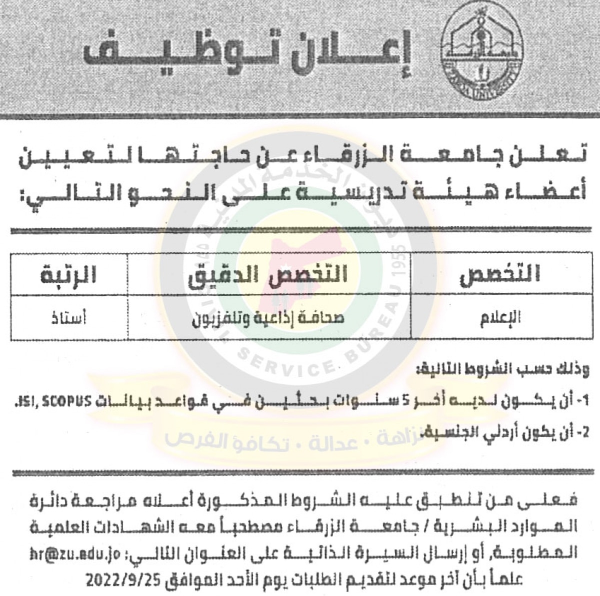 تعلن جامعة الزرقاء الأهلية عن حاجتها لتعيين أعضاء هيئة تدريسية في تخصص الإعلام