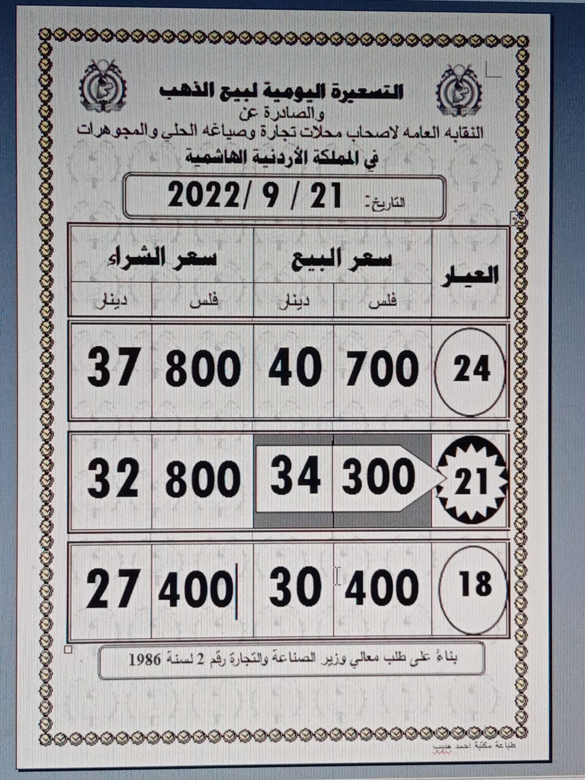 22 الإعلامي- أصدرت النقابة العامة لأصحاب محلات تجارة و صياغة الحُلي والمُجوهرات، نشرة تسعيرة الذهب المحلي وحسب رصد موقع 22 الإعلامي لنشرة الـيوم الموافق الأربعاء 21/9/2022 في المملكة الأردنية الهاشمية .